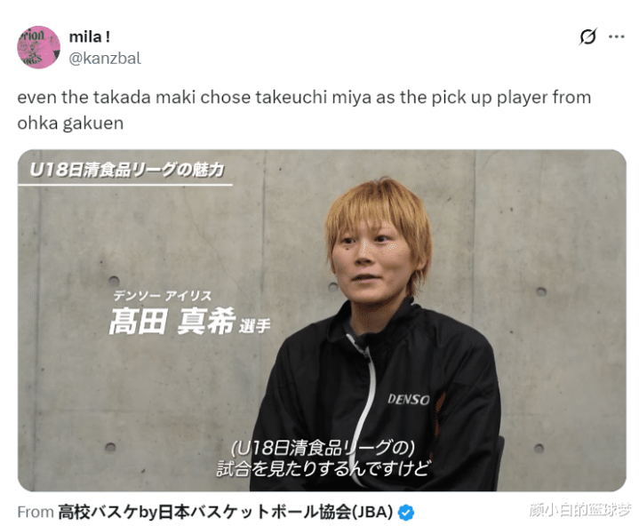 日本女篮一队的高田真希就在采访中谈到过她看好新一届日本U16女篮的竹内美也,她认为这个小女孩很有天赋。