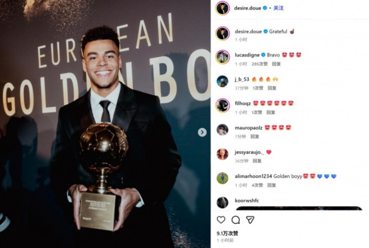 杜埃社媒纪念赢得金童奖: 感谢巴黎俱乐部上下以及我的启蒙教练